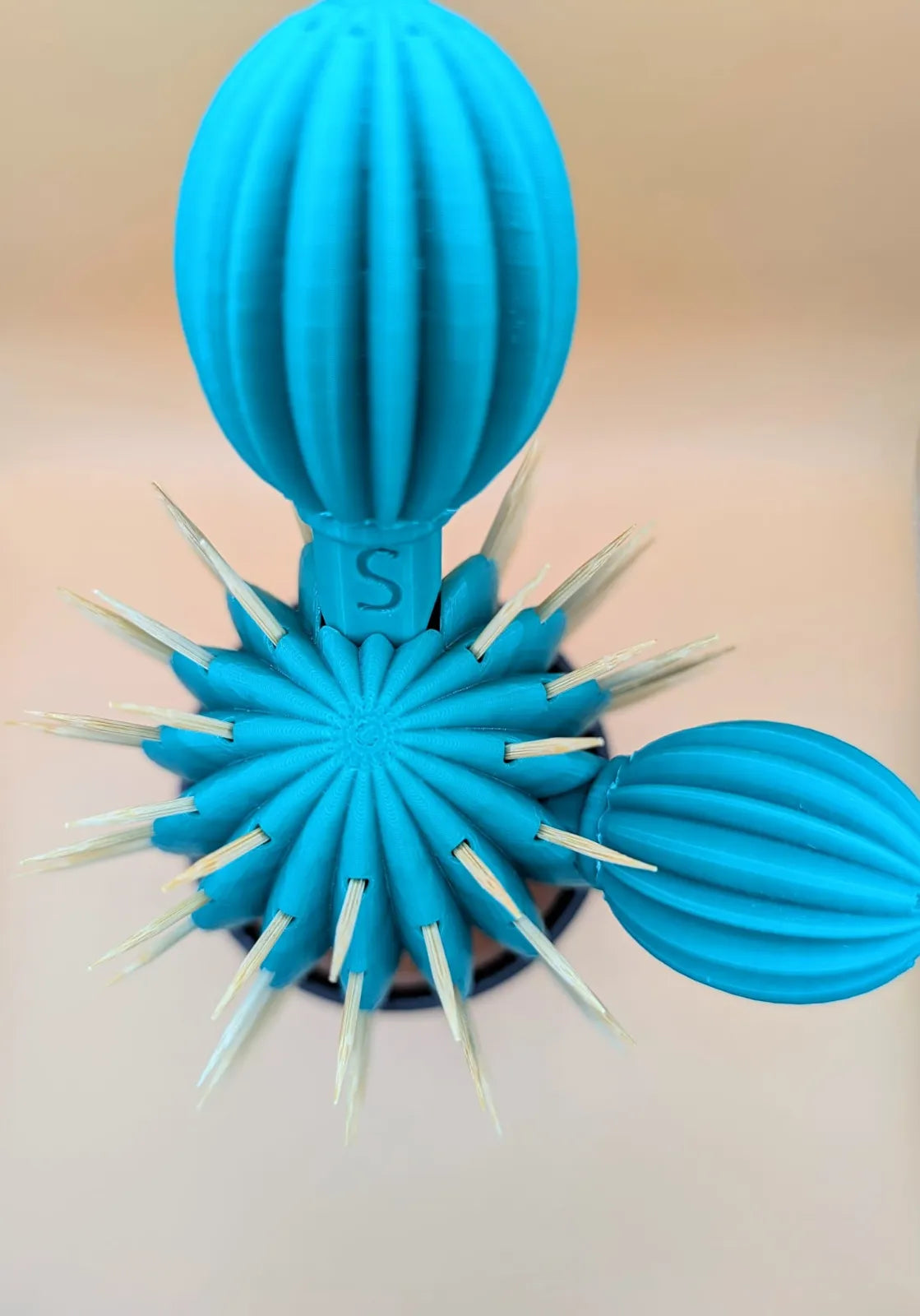 Cactusul central e gândit să ții scobitorile ca niște țepi. E amuzant, dar și super practic – toată lumea are acces ușor și elegant.